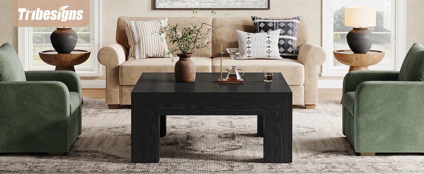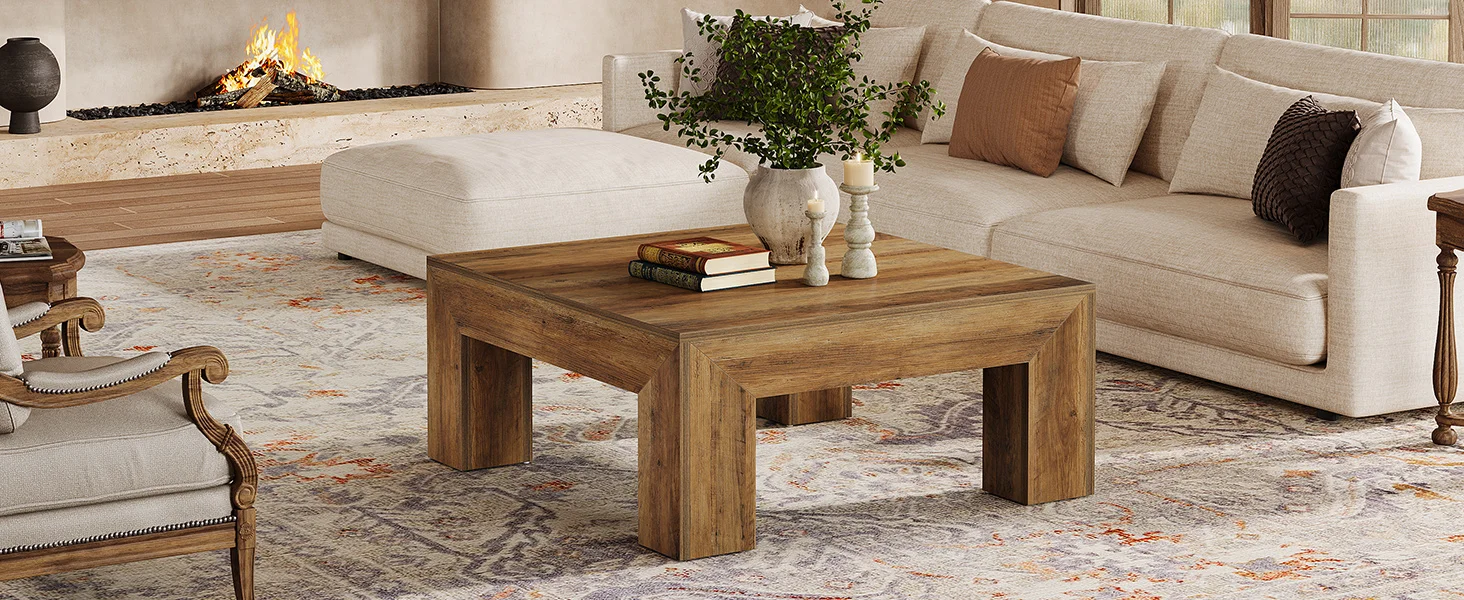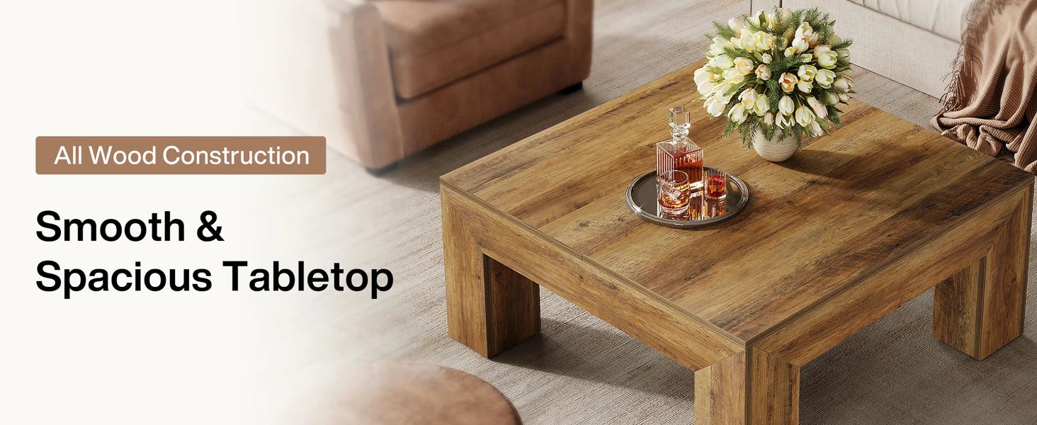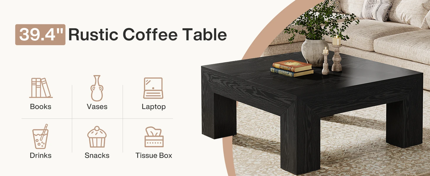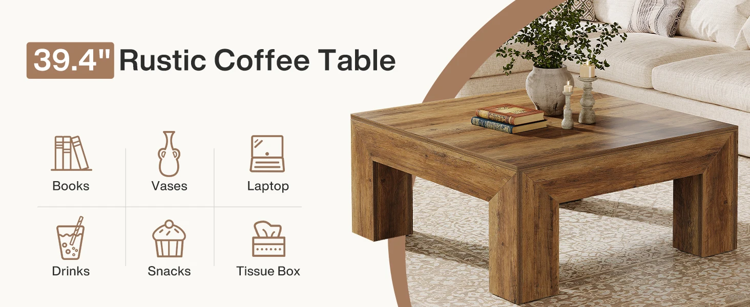 Ample Storage Space: Measuring 39.4" W x 39.4" D x 19.7" H, with a spacious tabletop, this square living room center table provides plenty of room for books, decor, or snacks, allowing you to enjoy a cozy yet organized afternoon tea time