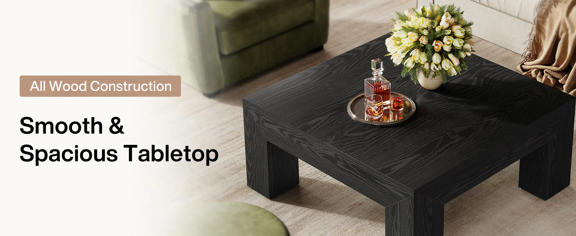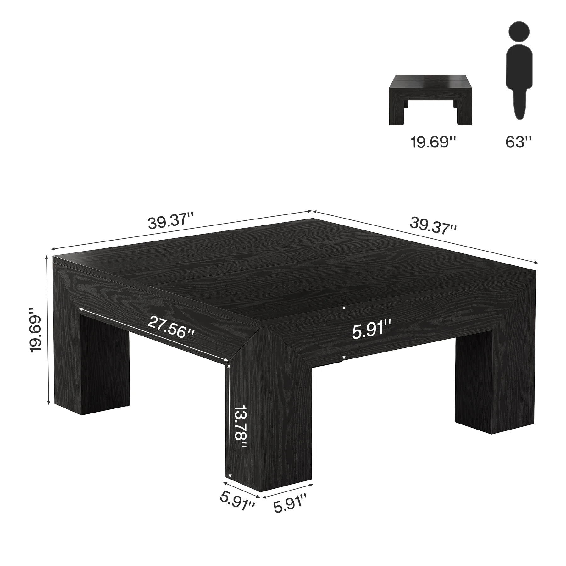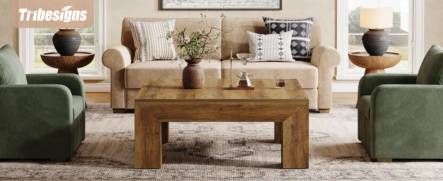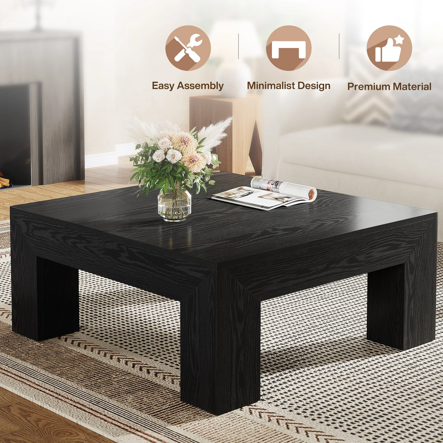 Ample Storage Space: Measuring 39.4" W x 39.4" D x 19.7" H, with a spacious tabletop, this square living room center table provides plenty of room for books, decor, or snacks, allowing you to enjoy a cozy yet organized afternoon tea time